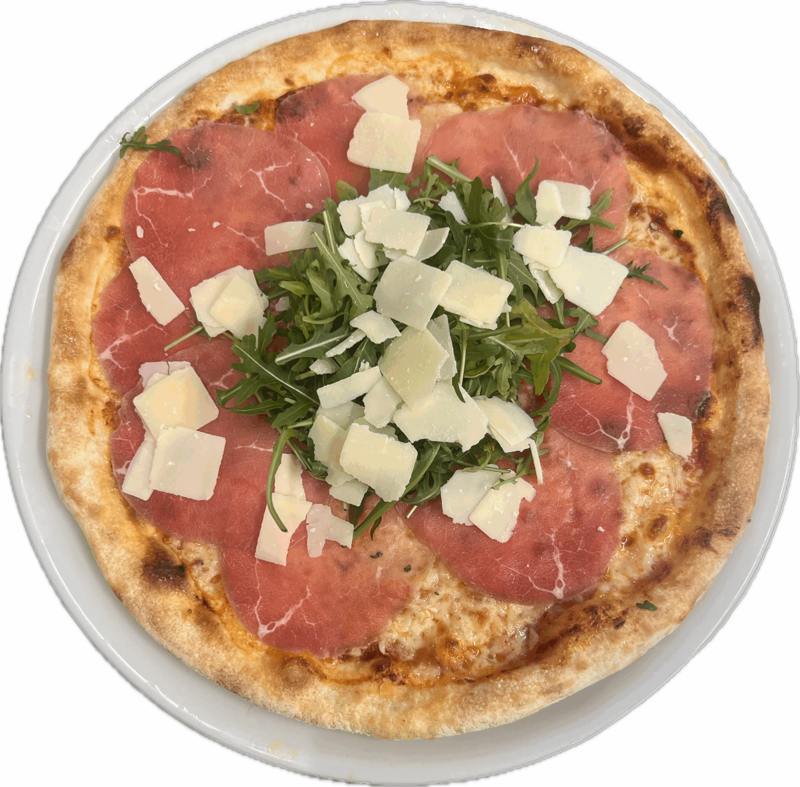 Pizza CarpaccioTomaten Mozzarella, Rindscarpaccio, Rucola, Parmigiano Oregano