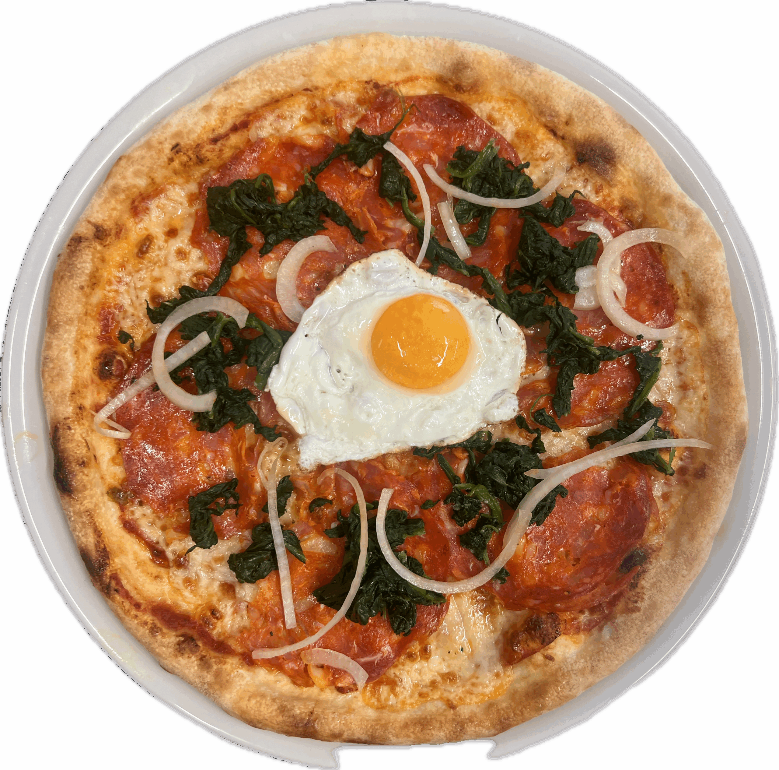 Tomaten, Mozzarella, mit Spinat, scharfer Salami, Ei, Zwiebeln